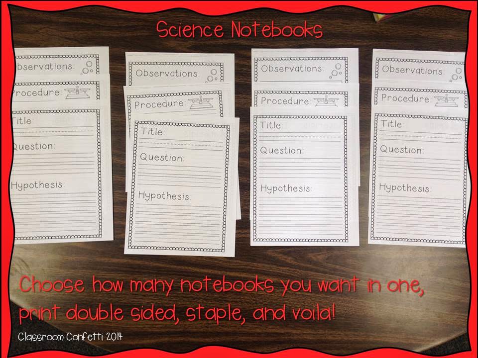 I love these notebooks because of the variation. You can vary the experiment type and how students record observations. You can also vary how many "notebooks" are printed in one book. For the beginning of the year it may be easier to do one to three "notebooks" and staple them together. Towards the middle of the year you can increase the amount you copy off.