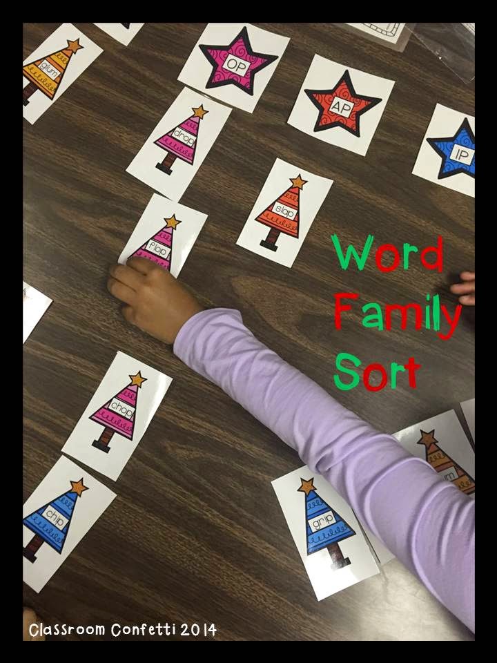 This Christmas tree sort is so great for differentiation. The words that need to be sorted have different blends to help students understand word families more in depth. There are seven different word families included. I differentiate which word families my students use.