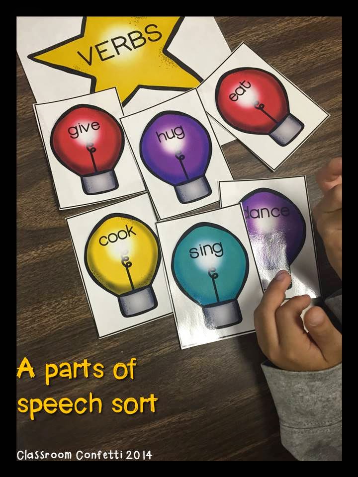 I love Christmas lights, they are my favorite part of Christmas season. I love how bright and happy they make neighborhoods during the holiday season. I had to make a center that involved these colorful lights. Students practice sorting words into the correct part of speech. After, students choose two words from each category to write and draw a picture. Drawing a picture of the word helps reinforce student understanding of that word's part in a sentence.